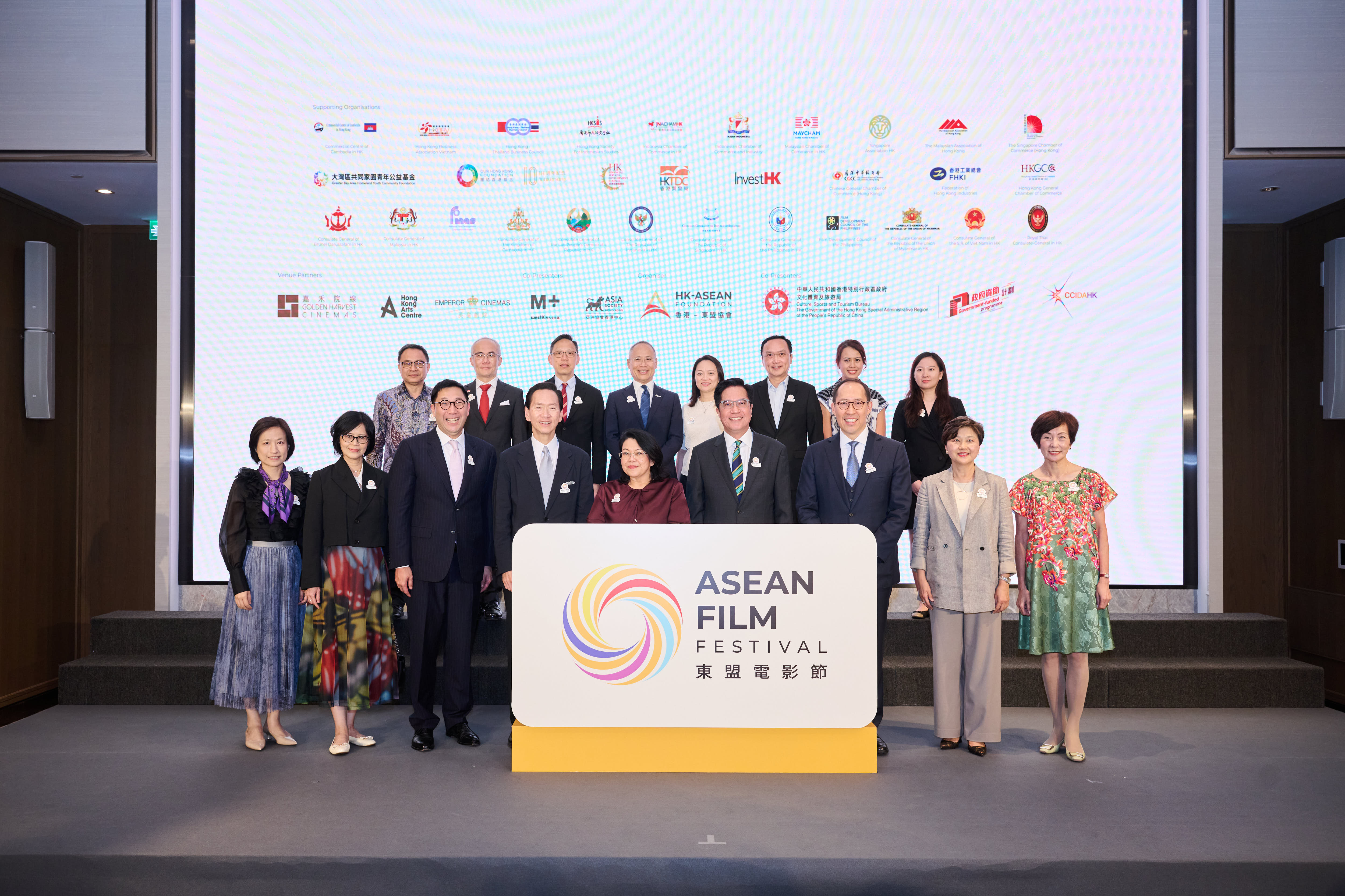 香港特別行政區政府署理財政司司長黃偉綸先生,GBS,JP (前排左四)、東盟國家代表暨汶萊駐香港總領事Ainatol Zahayu Mohammad女士 (前排圖中)、香港-東盟協會顧問委員會成員陳智思先生,GBM,GBS,JP (前排右四)、香港-東盟協會主席黃永光先生,SBS,JP(前排左三) 與各支持機構代表合照,感謝其積極協助提升電影節參與度。